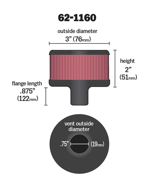 K&N crankcase vent filters are perfect for racing applications, vintage cars or individuals who want to add some aesthetics to their classic carbureted engine. The 62-1160 crankcase vent filter has a K&N embossed chrome-plated steel top and chrome-plated steel base. The 3/4 inch diameter zinc tube is designed to push in and clamp directly on to metal or plastic tubing where venting is needed. Constructed with a non-woven synthetic filter media it can be cleaned and reused repeatedly.