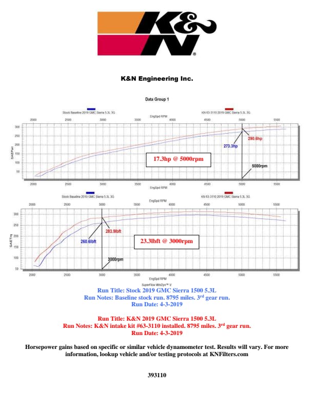 - DYNO TESTING YOU CAN TRUST: K&N air intake horsepower/torque testing is performed on wheel-based dynamometers and the reports are included with each intake system.