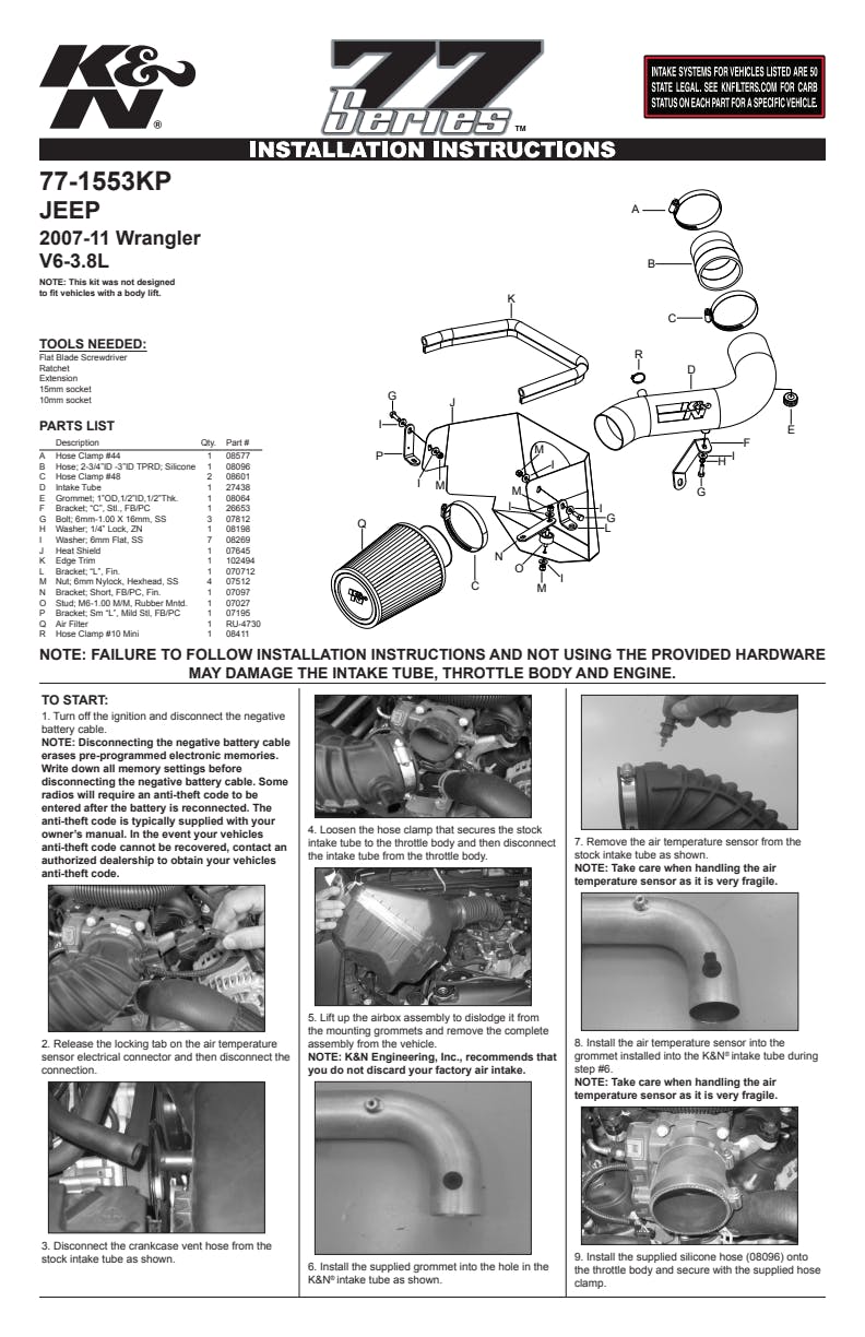 K&N's mandrel-bent aluminum cold air intake systems are guaranteed to provide an increase in horsepower and torque, and are protected by the K&N No-Hassle Lifetime Limited Warranty.