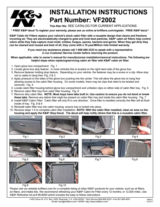Easy To Clean And Reuse; Freshens And Cleans Incoming Cabin Air; Helps Controls Odors; Factory Fit - Pretreated And Ready To Install; Electrostatically Charged To Hold Dirt And Dust; 10 Year/100 000 Mile Limited Warranty