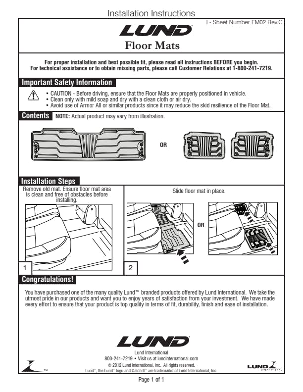 LUND?s Catch-It Vinyl floor liners provide rugged all-weather protection with the style and performance engineered to last a lifetime. The custom-molded design fits your vehicle perfectly for full coverage, a factory-installed look, along with an aggressively nibbed underside ensuring your liners stay firmly in place at all times. The Catch-It Vinyl floor liners also feature a raised perimeter design for added protection keeping spills from running off the liner.