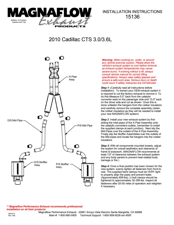 The MagnaFlow 2010-2014 Cadillac CTS Street Series Cat-Back Performance Exhaust System brings out the personality of your 3.0L, 3.6L 2010-2014 Cadillac CTS with our signature resonant, powerful engine tone and dyno-proven performance. Thanks to its fast-flowing, mandrel bent 2.25in. main piping and 4 Straight-Through mufflers ending in a Dual Split Rear exit with 4in. Polished Welded-On Double Wall Angle Cut Rolled Edge tips, this Cadillac CTS exhaust kit has the performance chops to match its sporty sound and appearance. Upgrade your ride to the next level with an exhaust that has the pipes to put other Cadillac CTS's to shame. With this system your vehicle will be producing Moderate exterior and Mild interior sound levels while leaving other cars and trucks feeling envious at every stoplight. Exhaust kit 15136 features a cat-back layout that replaces your ride's stock exhaust components from near the catalytic converter on back. Extensive 3D scanning during development has resulted in a direct-fit design that you can easily install yourself. 15136 is produced using CNC precision robotic manufacturing techniques and is backed by MagnaFlow's 1-year limited finish warranty and limited lifetime construction warranty.