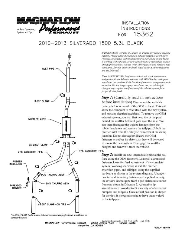 The Street Series Black Performance Exhaust system delivers dyno proven power with a comfortable interior sound and performance exterior sound. Features Black coated tips. MagnaFlow Performance Exhaust System Kit 15362 is made of durable stainless steel and built using CNC precision robotic manufacturing techniques, all backed by MagnaFlow’s limited lifetime construction warranty and 1 year finish warranty.