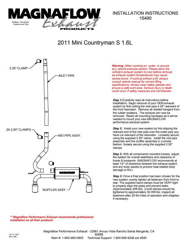 The MagnaFlow Touring Series Cat-Back Performance Exhaust System 15490 is the perfect partner for your 1.6L 2011-2016 Mini to take on a grand tour or a weekend cruise thanks to the powerful, resonant exhaust note and dyno-proven performance it brings to the table. This durable, corrosion resistant stainless steel exhaust kit is engineered to conquer the miles with ease while enhancing your driving experience with Moderate exterior and Mild interior sound levels generated through its fast-flowing, mandrel bent 2.5in. main piping and 1 Straight-Through muffler that terminate in a Dual Split Rear exit with 4in. Polished Welded-On Double Wall Angle Cut Rolled Edge tips. 15490 features a cat-back layout design to replace your import's stock exhaust components from the catalytic converter on back. This Mini exhaust system is compatible with 2011-2016 engines. The use of extensive 3D scans made during the development process has resulted in an easy-to-install, direct-fit design that fits your Mini like a glove. 15490 is produced using CNC precision robotic manufacturing techniques and is backed by MagnaFlow's limited lifetime construction warranty.