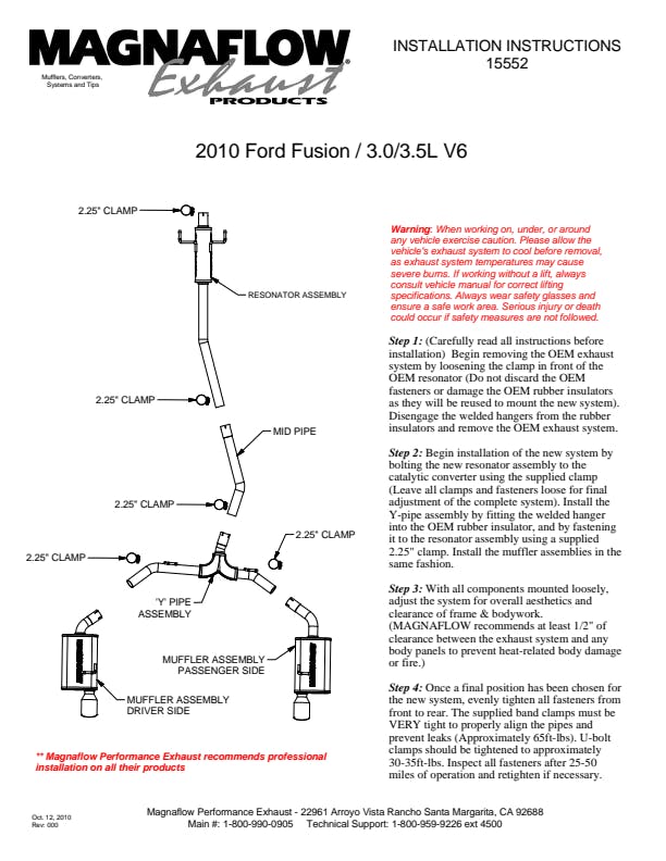 The MagnaFlow 2007-2012 Ford Fusion Street Series Cat-Back Performance Exhaust System brings out the personality of your 3.0L, 3.5L 2007-2012 Ford Fusion with our signature resonant, powerful engine tone and dyno-proven performance. Thanks to its fast-flowing, mandrel bent 2.25in. main piping and 3 Straight-Through mufflers ending in a Dual Split Rear exit with 4in. Polished Welded-On Double Wall Angle Cut Folded Edge tips, this Ford Fusion exhaust kit has the performance chops to match its sporty sound and appearance. Upgrade your ride to the next level with an exhaust that has the pipes to put other Ford Fusion's to shame. With this system your vehicle will be producing Moderate exterior and Mild interior sound levels while leaving other cars and trucks feeling envious at every stoplight. Exhaust kit 15552 features a cat-back layout that replaces your ride's stock exhaust components from near the catalytic converter on back. Extensive 3D scanning during development has resulted in a direct-fit design that you can easily install yourself. 15552 is produced using CNC precision robotic manufacturing techniques and is backed by MagnaFlow's 1-year limited finish warranty and limited lifetime construction warranty.