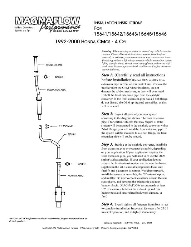 The MagnaFlow 1992-2000 Honda Civic Street Series Cat-Back Performance Exhaust System brings out the personality of your 1.5L, 1.6L 1992-2000 Honda Civic with our signature resonant, powerful engine tone and dyno-proven performance. Thanks to its fast-flowing, mandrel bent 2.25in. main piping and 2 Straight-Through mufflers ending in a Single Straight Passenger Side Rear exit with 4in. Polished Welded-On Single Wall Straight Cut Edge tips, this Honda Civic exhaust kit has the performance chops to match its sporty sound and appearance. Upgrade your ride to the next level with an exhaust that has the pipes to put other Honda Civic's to shame. With this system your vehicle will be producing Moderate exterior and Mild interior sound levels while leaving other cars and trucks feeling envious at every stoplight. Exhaust kit 15643 features a cat-back layout that replaces your ride's stock exhaust components from near the catalytic converter on back. Extensive 3D scanning during development has resulted in a direct-fit design that you can easily install yourself. 15643 is produced using CNC precision robotic manufacturing techniques and is backed by MagnaFlow's 1-year limited finish warranty and limited lifetime construction warranty.