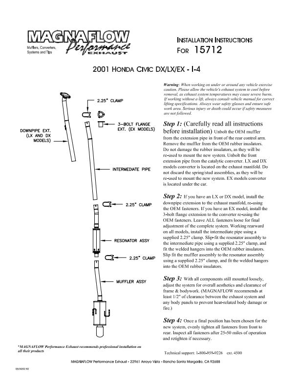 The MagnaFlow 2001-2005 Honda Civic Street Series Cat-Back Performance Exhaust System brings out the personality of your 1.7L 2001-2005 Honda Civic with our signature resonant, powerful engine tone and dyno-proven performance. Thanks to its fast-flowing, mandrel bent 2.25in. main piping and 2 Straight-Through mufflers ending in a Single Straight Passenger Side Rear exit with 4in. Polished Welded-On Double Wall Angle Cut Folded Edge tips, this Honda Civic exhaust kit has the performance chops to match its sporty sound and appearance. Upgrade your ride to the next level with an exhaust that has the pipes to put other Honda Civic's to shame. With this system your vehicle will be producing Moderate exterior and Mild interior sound levels while leaving other cars and trucks feeling envious at every stoplight. Exhaust kit 15712 features a cat-back layout that replaces your ride's stock exhaust components from near the catalytic converter on back. Extensive 3D scanning during development has resulted in a direct-fit design that you can easily install yourself. 15712 is produced using CNC precision robotic manufacturing techniques and is backed by MagnaFlow's 1-year limited finish warranty and limited lifetime construction warranty.