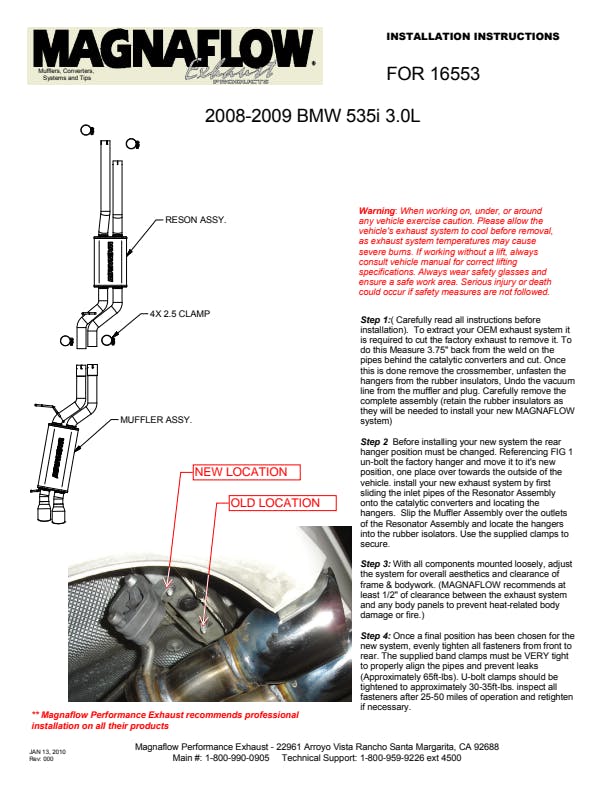 The MagnaFlow 2008-2010 BMW 535i Touring Series Cat-Back Performance Exhaust System is the perfect partner for your 3.0L 2008-2010 BMW 535i to take on a grand tour or a weekend cruise thanks to the powerful, resonant exhaust note and dyno-proven performance it brings to the table. This durable, corrosion resistant stainless steel exhaust kit is engineered to conquer the miles with ease while enhancing your driving experience with Moderate exterior and Mild interior sound levels generated through its fast-flowing, mandrel bent 2.5in. main piping and 2 Straight-Through muffler that terminate in a Dual Straight Driver Side Rear exit with 3.5in. Polished Welded-On Double Wall Angle Cut Folded Edge tips. 16553 features a cat-back layout design to replace your import's stock exhaust components from the catalytic converter on back. This BMW 535i exhaust system is compatible with 2008-2010 engines. The use of extensive 3D scans made during the development process has resulted in an easy-to-install, direct-fit design that fits your BMW 535i like a glove. 16553 is produced using CNC precision robotic manufacturing techniques and is backed by MagnaFlow's limited lifetime construction warranty.