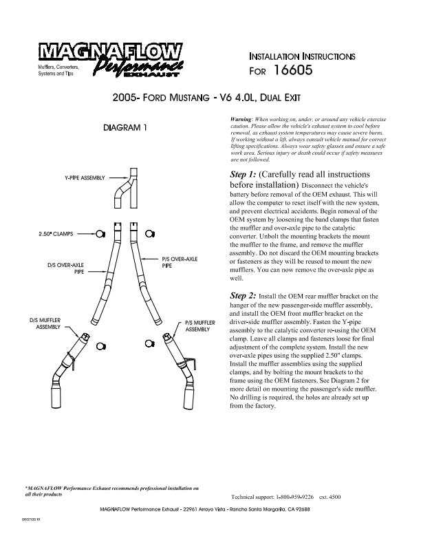 The MagnaFlow 2005-2009 Ford Mustang Competition Series Cat-Back Performance Exhaust System brings an aggressive, attention-grabbing edge to the deep resonant exhaust note we're so well known for. This exhaust kit is designed to enhance your 4.0L 2005-2009 Ford Mustang with dyno-proven performance made possible thanks to fast-flowing mandrel bent 2.5in. main piping and 2 Straight-Through mufflers ending in a Dual Split Rear exit with 3.5in. Polished Welded-On Double Wall Angle Cut Rolled Edge tips featuring a sporty finish. The exhaust system's cat-back layout replaces your ride's exhaust system from near the catalytic converter on back. Exhaust system 16605 is engineered to make your vehicle's engine produce Aggressive exterior and Moderate interior sound levels, befitting its competition-oriented design. 16605's direct-fit design makes installation a breeze thanks to the use of advanced 3D scanning techniques. This performance exhaust system is made of 100% durable and corrosion-resistant stainless steel and produced using CNC precision robotic manufacturing, all backed by MagnaFlow's limited lifetime warranty. Please check to ensure compliance with local noise regulations.