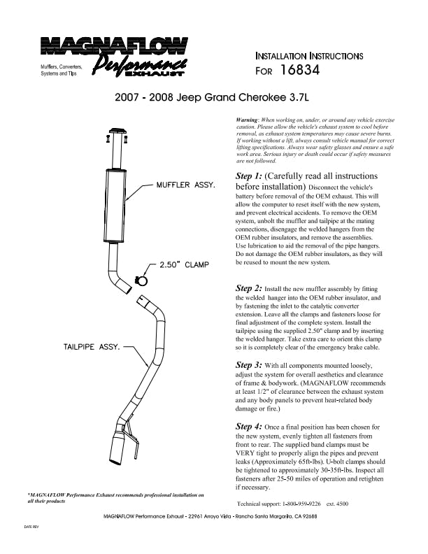 The MagnaFlow 2007-2010 Jeep Grand Cherokee Street Series Cat-Back Performance Exhaust System brings out the personality of your 3.7L 2007-2010 Jeep Grand Cherokee with our signature resonant, powerful engine tone and dyno-proven performance. Thanks to its fast-flowing, mandrel bent 2.5in. main piping and 1 Straight-Through mufflers ending in a Single Straight Passenger Side Rear exit with 3.5in. Polished Welded-On Double Wall Angle Cut Rolled Edge tips, this Jeep Grand Cherokee exhaust kit has the performance chops to match its sporty sound and appearance. Upgrade your ride to the next level with an exhaust that has the pipes to put other Jeep Grand Cherokee's to shame. With this system your vehicle will be producing Moderate exterior and Mild interior sound levels while leaving other cars and trucks feeling envious at every stoplight. Exhaust kit 16834 features a cat-back layout that replaces your ride's stock exhaust components from near the catalytic converter on back. Extensive 3D scanning during development has resulted in a direct-fit design that you can easily install yourself. 16834 is produced using CNC precision robotic manufacturing techniques and is backed by MagnaFlow's 1-year limited finish warranty and limited lifetime construction warranty.