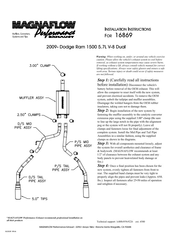 The MagnaFlow Street Series Cat-Back Performance Exhaust System 16869 brings out the personality of your Truck with our signature resonant, powerful engine tone and dyno-proven performance. Thanks to its fast-flowing, mandrel bent 3in. main piping and 1 Straight-Through mufflers ending in a Dual Split Rear exit with 5in. Polished Welded-On Double Wall Angle Cut Rolled Edge tips, this Truck exhaust kit has the performance chops to match its sporty sound and appearance. Upgrade your ride to the next level with an exhaust that has the pipes to put other Truck's to shame. With this system your vehicle will be producing Aggressive exterior and Moderate interior sound levels while leaving other cars and trucks feeling envious at every stoplight. Exhaust kit 16869 features a cat-back layout that replaces your ride's stock exhaust components from near the catalytic converter on back. Extensive 3D scanning during development has resulted in a direct-fit design that you can easily install yourself. 16869 is produced using CNC precision robotic manufacturing techniques and is backed by MagnaFlow's 1-year limited finish warranty and limited lifetime construction warranty.