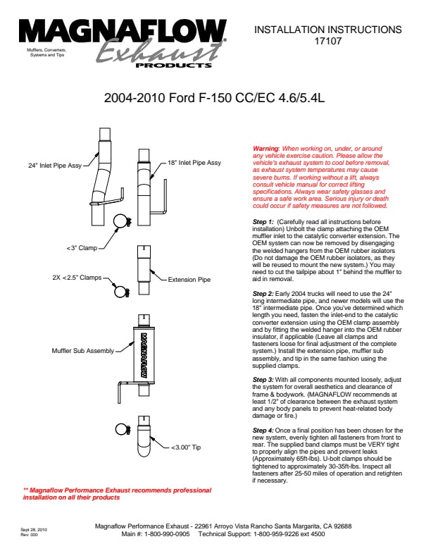 The MagnaFlow Off-Road Pro Series Cat-Back Performance Exhaust System 17107 brings additional off-roading prowess and our deep signature exhaust note to your Truck with a weight-optimized, dyno-tested, corrosion resistant and durable stainless steel design engineered to closely hug the undercarriage for improved ground clearance. Exhaust kit 17107 is engineered to produce Very Aggressive exterior and Aggressive interior sound levels. Extensive 3D scanning was used during the development of this Truck exhaust system to create a direct-fit design, enabling a do-it-yourself installation process. 17107's emissions-legal cat-back design replaces all your truck's exhaust components from the catalytic converter on back with its 3in. diameter mandrel bent main piping that passes through 1 Straight-Through mufflers before ending in a turndown before rear axle exit with 3in. Satin Clamp-On Single Wall Turndown Cut Edge tips. Exhaust system 17107 is produced using advanced CNC precision robotic manufacturing techniques and backed by MagnaFlow's limited lifetime warranty.