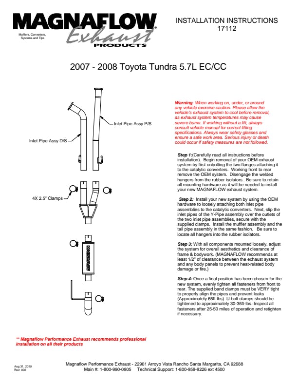 The MagnaFlow 2007-2008 Toyota Tundra Off-Road Pro Series Cat-Back Performance Exhaust System brings additional off-roading prowess and our deep signature exhaust note to your 5.7L 2007-2008 Toyota Tundra with a weight-optimized, dyno-tested, corrosion resistant and durable stainless steel design engineered to closely hug the undercarriage for improved ground clearance. Exhaust kit 17112 is engineered to produce Very Aggressive exterior and Aggressive interior sound levels. Extensive 3D scanning was used during the development of this Toyota Tundra exhaust system to create a direct-fit design, enabling a do-it-yourself installation process. 17112's emissions-legal cat-back design replaces all your truck's exhaust components from the catalytic converter on back with its 2.5in. diameter mandrel bent main piping that passes through 1 Straight-Through mufflers before ending in a turndown before rear axle exit with 3in. Satin Clamp-On Single Wall Turndown Cut Edge tips. Exhaust system 17112 is produced using advanced CNC precision robotic manufacturing techniques and backed by MagnaFlow's limited lifetime warranty.