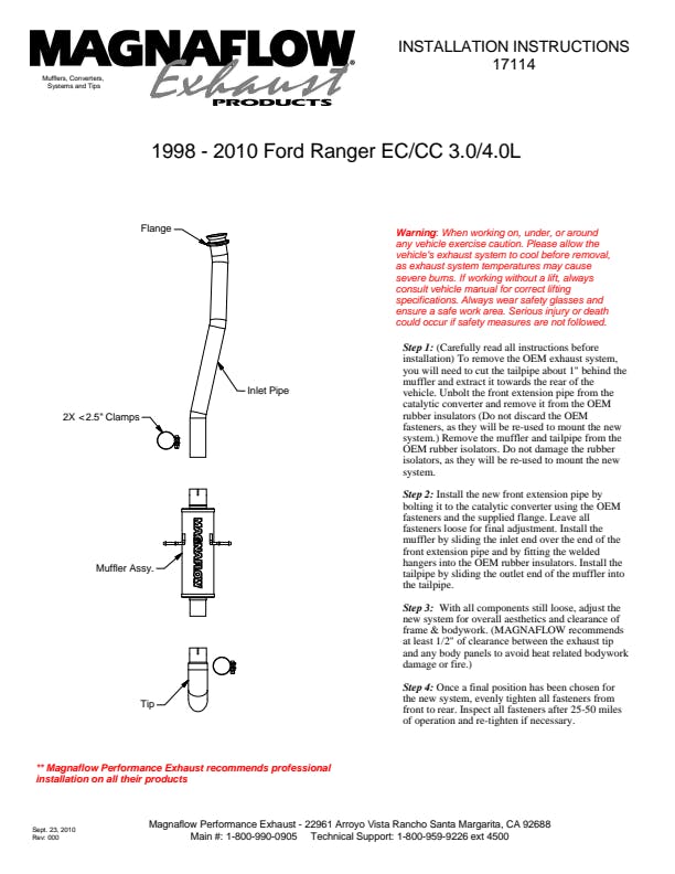 The MagnaFlow Off-Road Pro Series Cat-Back Performance Exhaust System 17114 brings additional off-roading prowess and our deep signature exhaust note to your Truck with a weight-optimized, dyno-tested, corrosion resistant and durable stainless steel design engineered to closely hug the undercarriage for improved ground clearance. Exhaust kit 17114 is engineered to produce Very Aggressive exterior and Aggressive interior sound levels. Extensive 3D scanning was used during the development of this Truck exhaust system to create a direct-fit design, enabling a do-it-yourself installation process. 17114's emissions-legal cat-back design replaces all your truck's exhaust components from the catalytic converter on back with its 2.5in. diameter mandrel bent main piping that passes through 1 Straight-Through mufflers before ending in a turndown before rear axle exit with 3in. Satin Clamp-On Single Wall Turndown Cut Edge tips. Exhaust system 17114 is produced using advanced CNC precision robotic manufacturing techniques and backed by MagnaFlow's limited lifetime warranty.