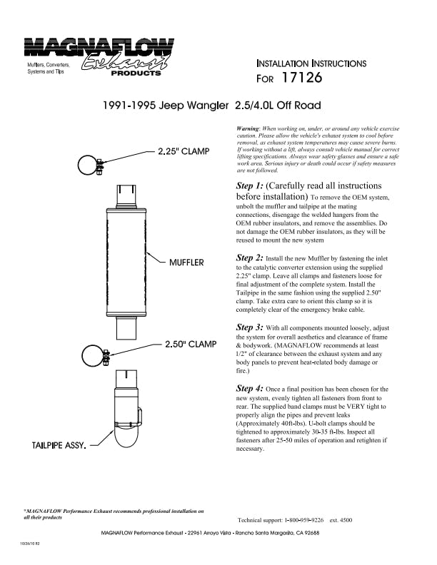 The MagnaFlow 1991-1995 Jeep Wrangler Off-Road Pro Series Cat-Back Performance Exhaust System brings additional off-roading prowess and our deep signature exhaust note to your 2.5L, 4.0L 1991-1995 Jeep Wrangler with a weight-optimized, dyno-tested, corrosion resistant and durable stainless steel design engineered to closely hug the undercarriage for improved ground clearance. Exhaust kit 17126 is engineered to produce Very Aggressive exterior and Aggressive interior sound levels. Extensive 3D scanning was used during the development of this Jeep Wrangler exhaust system to create a direct-fit design, enabling a do-it-yourself installation process. 17126's emissions-legal cat-back design replaces all your truck's exhaust components from the catalytic converter on back with its 2.5in. diameter mandrel bent main piping that passes through 1 Straight-Through mufflers before ending in a turndown before rear axle exit with 3in. Satin Clamp-On Single Wall Turndown Cut Edge tips. Exhaust system 17126 is produced using advanced CNC precision robotic manufacturing techniques and backed by MagnaFlow's limited lifetime warranty.