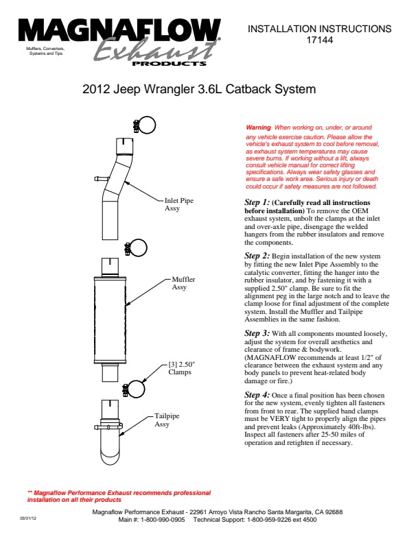 The MagnaFlow Off-Road Pro Series Cat-Back Performance Exhaust System 17144 brings additional off-roading prowess and our deep signature exhaust note to your 3.6L 2012-2018 Jeep with a weight-optimized, dyno-tested, corrosion resistant and durable stainless steel design engineered to closely hug the undercarriage for improved ground clearance. Exhaust kit 17144 is engineered to produce Very Aggressive exterior and Aggressive interior sound levels. Extensive 3D scanning was used during the development of this Jeep exhaust system to create a direct-fit design, enabling a do-it-yourself installation process. 17144's emissions-legal cat-back design replaces all your truck's exhaust components from the catalytic converter on back with its 2.5in. diameter mandrel bent main piping that passes through 1 Straight-Through mufflers before ending in a turndown before rear axle exit with 3in. Satin Clamp-On Single Wall Turndown Cut Edge tips. Exhaust system 17144 is produced using advanced CNC precision robotic manufacturing techniques and backed by MagnaFlow's limited lifetime warranty.