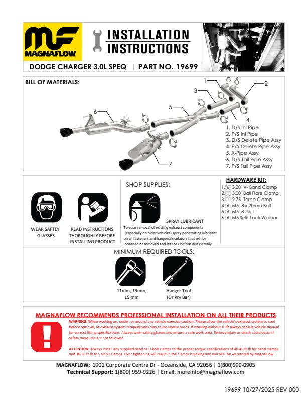 The MagnaFlow SPEQ Series #19699 cat-back exhaust system is engineered as the ultimate performance upgrade for the Dodge Charger powered by the new twin-turbo L6 3.0L Sixpack. Designed to amplify modern muscle sound, flow, and power, this dyno proven system combines precision manufacturing with an aggressive sound profile. It is constructed from high-flow 3” mandrel-bent premium 304 stainless steel tubing for exceptional corrosion resistance and long-term structural integrity. Connections are secured using race-bred V-band clamps, providing a leak-free assembly that remains stable across heat cycles. Exhaust flow is optimized through a Tru-X crossover x-pipe that enhances pulse scavenging and smooths transitions. This feeds into mid-body straight pipe deletes and a pair of straight-through mufflers engineered specifically for the high-output Sixpack engine. The result is a deep, assertive tone that comes alive under throttle while preserving a drone-free cabin experience at cruising speeds. The system exits through dual split 4.5” black chrome tips etched with the MagnaFlow logo, delivering a striking appearance that matches the system’s performance-focused attitude. Fitment is precise due to 3D scanning and CNC robotic manufacturing, ensuring a direct-fit installation that replaces all factory components behind the catalytic converters. Reinforced hangers provide solid attachment to OEM mounting points, maintaining secure alignment and stability. Full factory valve functionality is retained by MagnaFlow’s cast stainless performance valves, allowing full integration with the Charger’s active sound management and drive modes. Backed by MagnaFlow’s limited lifetime construction warranty, this cat-back delivers a measurable upgrade in sound quality, flow efficiency, and overall power. Designed with a focus on real-world performance, it enhances the twin-turbo Charger with a power-focused exhaust tone and the premium construction demanded by modern high-output muscle.