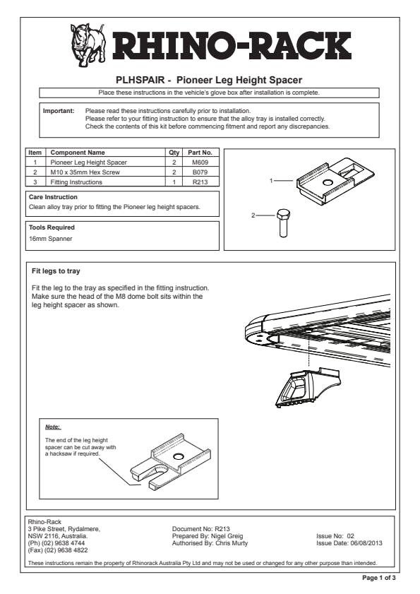 The Pioneer Leg Height Spacers are used to level a Pioneer system on a vehicle. Attached between either a Rhino-Rack RLCP or RL leg and a Pioneer Platform or Tray, these set of spacers will raise the Pioneer to allow the legs to slide out wider, approximately by 75mm overall. This allows each of the Pioneers to fit a wider ranger of vehicles, with the option of choosing a narrower tray/platform rather than a larger one.