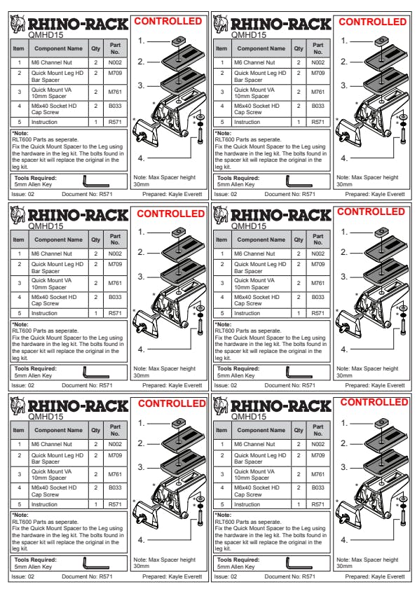 The Quick Mount™ Heavy Spacer (15mm) allows you to fit the Rhino-Rack Heavy Duty Bars to RLT600, RCH and RCL legs. This kit fits 1 bar.