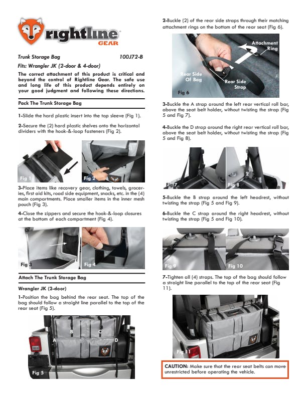 Weatherproof storage for your Jeep Wrangler's unused space! The Rightline Gear Side Storage Bag holds recovery gear, clothing, towels, first aid kits, roadside equipment, snacks etc. The bag is angled to perfectly fit over the rear wheel well and features a zippered pocket, a mesh pocket, quick release buckle straps, a carry handle, and a shoulder strap. A hard plastic insert in the top of the bag provides shape and structure. The bag is made from tough PVC Coated Mesh that is re-enforced for strength and UV protected. Use the Side Storage Bag for off-roading, road trips, and every day storage.