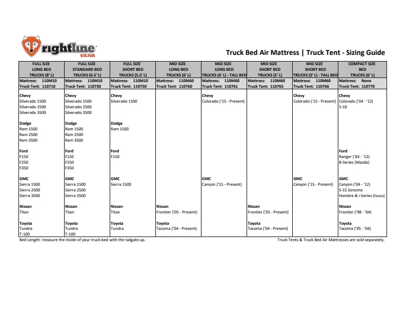 Dimensions: 80” L x 51” W x 7” H; Fits: all full size trucks – short bed (5.5’), standard bed (6.5’), and long bed (8’); Sleeps (2) adults; Sized to fit between the truck’s wheel wells; Designed to allow side storage of clothes, duffle bags, keys, phones, glasses, flashlights, etc.; Includes: mattress, air pump, patch kit, stuff sack, and set up guide