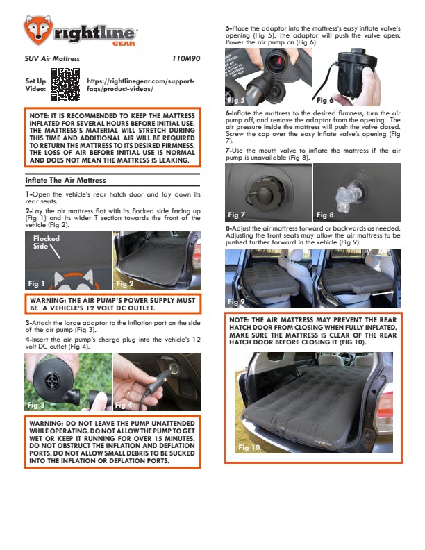 A mattress tough enough for your SUV! The Rightline Gear SUV Air Mattress is made from heavy duty PVC with a comfortable flocked top surface. T-shape design maximizes mattress fit in rear cargo areas. O-beam support ensures you will get a good night's sleep. The 12V air pump and easy inflate valve let you inflate or deflate the mattress in seconds. The SUV Air Mattress folds up into a stuff sack for easy storage.
