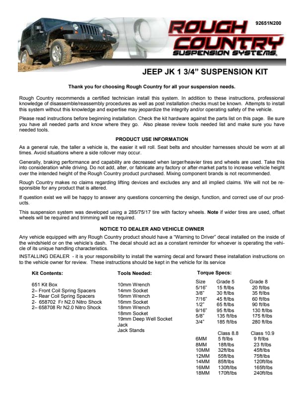 Give your Jeep a more aggressive look with Rough Country's easy-to-install 1.75in Suspension Lift. This all-inclusive kit comes with everything you need to run up to 32in tires in an innovative kit that won t break the bank! Featuring front and rear coil spacers, this kit gives your Jeep a great boost for additional ride height and an eye-catching level look from front to rear. This kit is engineered with a spring retention design, ensuring that your coils always stay class in place even during extreme articulation. This easy-to-install kit features a 100% bolt-on installation process that s easy enough to do in a home garage! Enjoy the lifted life with Rough Country's 1.75in Suspension Lift Kit!