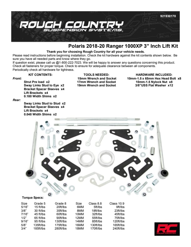 Conquer Tough Trails with a 3-Inch Lift: Take your Polaris Ranger to the next level with Rough Country's 3-Inch Lift Kit. Engineered for off-road performance, this kit delivers a full 3-inch lift from front to rear, giving your UTV increased ground clearance and a more aggressive stance. Durable, Bolt-On Performance: Designed for easy installation, this kit includes heavy-duty aluminum spacers that mount directly onto the factory strut, along with front and rear lift brackets for a seamless upgrade. The added clearance allows you to run up to 28-inch tires, letting you customize your Ranger with bold, aftermarket wheel and tire combos for a one-of-a-kind look. Built for Stability & Strength: To keep your ride smooth and components properly aligned, this kit features extended sway links and bracket spacer sleeves for optimal suspension angles after lifting. Plus, enjoy peace of mind with Rough Country's Limited Lifetime Replacement Guarantee - built for durability, backed with confidence!