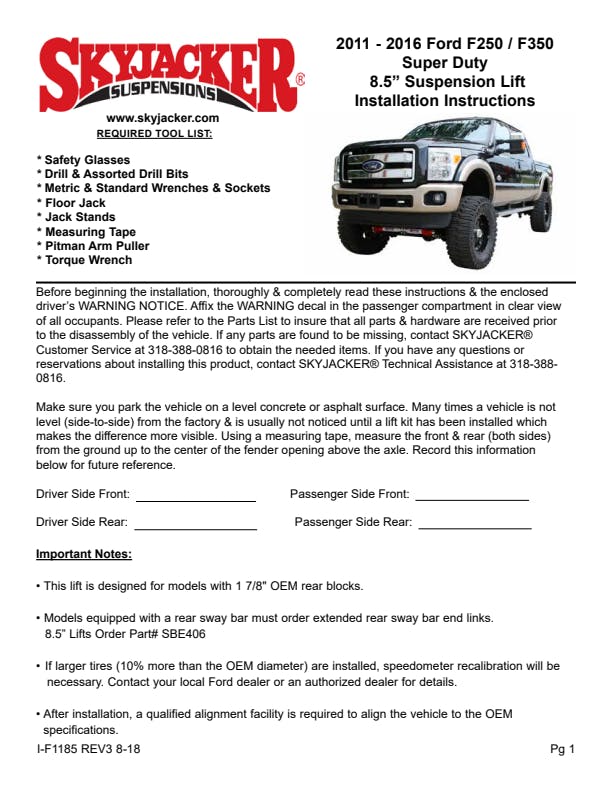 Skyjacker re-engineered the Super Dutys suspension via an outstanding 8.5-inch 4-Link Conversion. Replace your OEM radius arm mounts with integrated radius arm drop brackets plus upper and lower adjustable control arms. Formed from 2-inch OD x 0.250 wall DOM tubing, both pairs of control arms are adjustable Flex Links. The adjustability allows proper caster settings to improve handling. Flex Links have a forked clevis end at the lower axle mount. The upper bracket mount has 1-1/4 in. forged rod end with Rubber Encased bushing. Skyjacker's legendary Softride(R) technology engineered processes achieve maximum wheel travel, ride quality and extends the long-lasting life of the coil spring. Skyjacker specifically engineered this Variable Rate Coil Spring for the Super Duty 4WD Gas to deliver a smoother ride. A heavy-duty track bar relocation bracket captures the front crossmember on both sides to prevent movement in this high-stress area and to keep the axle centered. Lowering brackets realign the front sway bar for maximum sway control. Drop spacers reposition the front bump stops. Front brake line extension brackets correctly reposition the brake lines. A heavy-duty steering stabilizer relocation bracket corrects and enforces the stabilizer connection. A 5.5-inch rear block and U-bolt kit with Softride(R) Technology Add-A-Leaf springs yields a more level stance. Skyjacker Softride(R) Technology enhances every aspect of the add-a-leaf spring performance. E-brake relocation brackets, bump stop spacers, rear braided stainless steel brake line extensions and rear exhaust hanger brackets are included. Front and rear damper capacity enhanced with ADX 2.0 Adventure Series Remote Reservoir Aluminum Monotube Shocks. ADX 2.0 has a race-inspired full-displaced valving system. Nitrogen charged with Internal Floating Piston Technology = Quickest Shock Reaction Time Ever.