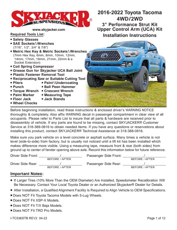 Raise your Tacoma's altitude to a bold new attitude. This Skyjacker lift system will raise your ride height. Add aggressive off-road tires for greater ground clearance. Tackle your exciting daily highway adventures and the trail's toughest terrains with an attitude of altitude.