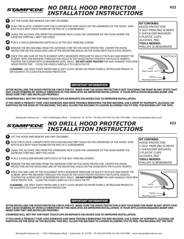 Each Vigilante Hood Protector is precision engineered to fit your vehicle and installs easily using 3M automotive-grade adhesive. No special hardware or drilling is required! Car-wash safe, and UV and scratch-resistant, Stampede Automotive Accessories Hood Protectors are proudly made in the USA of impact-resistant acrylic in a range of finishes including smoke, chrome, American flag and genuine licensed Mossy Oak and Realtree camouflage patterns.