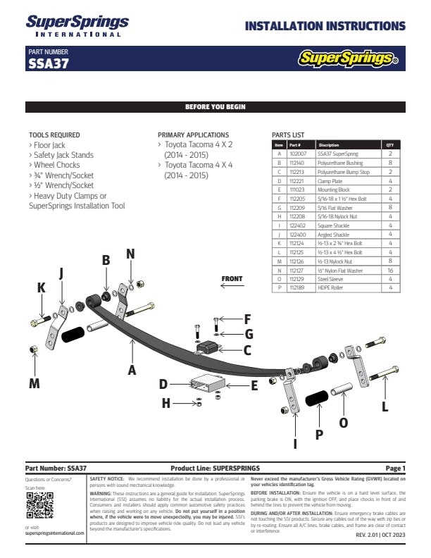 SuperSprings are a unique and patented self-adjusting suspension stabilizing system for vehicles with rear leaf springs, designed to level loads and reduce body roll. SuperSprings provide users extra load support and reduce body roll without compromising ride quality. They are manufactured using a variety of different sized springs to support multiple applications. All SuperSprings are manufactured in the U.S.A. from SAE5160H high grade, shot peened steel.