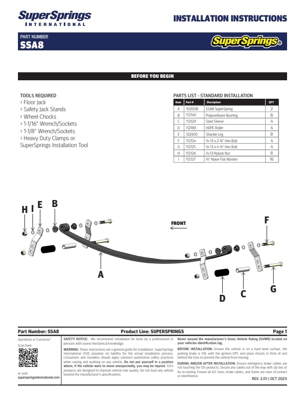 SuperSprings are a unique and patented self-adjusting suspension stabilizing system for vehicles with rear leaf springs, designed to level loads and reduce body roll. SuperSprings provide users extra load support and reduce body roll without compromising ride quality. They are manufactured using a variety of different sized springs to support multiple applications. All SuperSprings are manufactured in the U.S.A. from SAE5160H high grade, shot peened steel.
