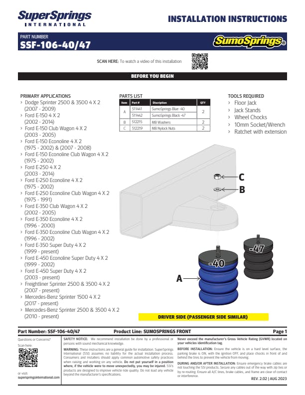SumoSprings Front for Ford E-150/E-250, Ford E-350/E-450, Mercedes-Benz Sprinter 2500/3500.