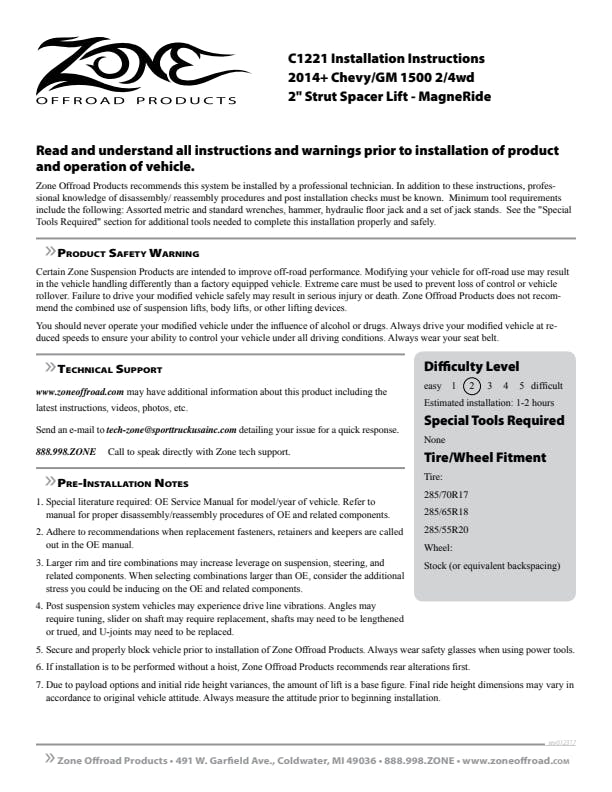Level out the stance with this quick and easy to install 2" leveling kit from Zone Offroad. Retains full functionality of MagneRide system. Get the look your truck deserves, while maintaining ride quality with clearance for up to 34" tires.
