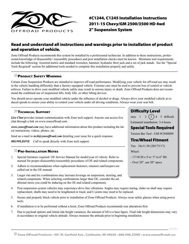Take your Chevy/GMC HD to new heights with this 2" lift kit from Zone Offroad. Kits include indexed torsion bar keys, front shock extensions, and a 2" rear block kit to retain the tail high stance. Get the look, performance, and capability your truck deserves with clearance for up to 34" tires.