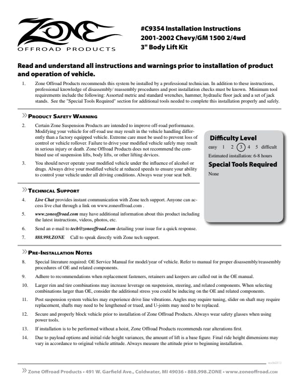 You can take the road less traveled when you install this 3 Body Lift Kit. Built around crush proof body blocks capable of holding up to 60,000 lbs., this complete system is everything you need to get the look you want for your 2001 - 2002 Chevy/GM 1500 Truck.