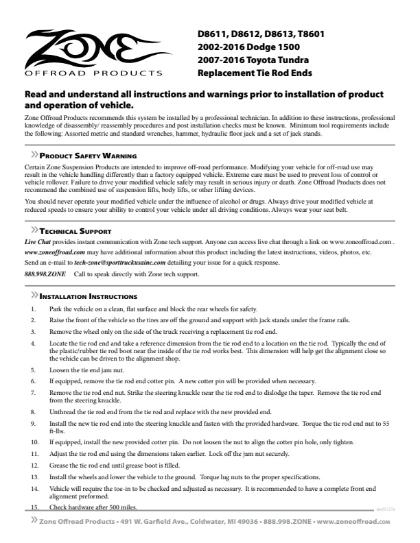 This replacement tie rod end kit is designed for Ram 1500 trucks equipped with Zone Offroad suspension lift kits. Improve the steering responsiveness and handling, kit includes (1) tie rod end.