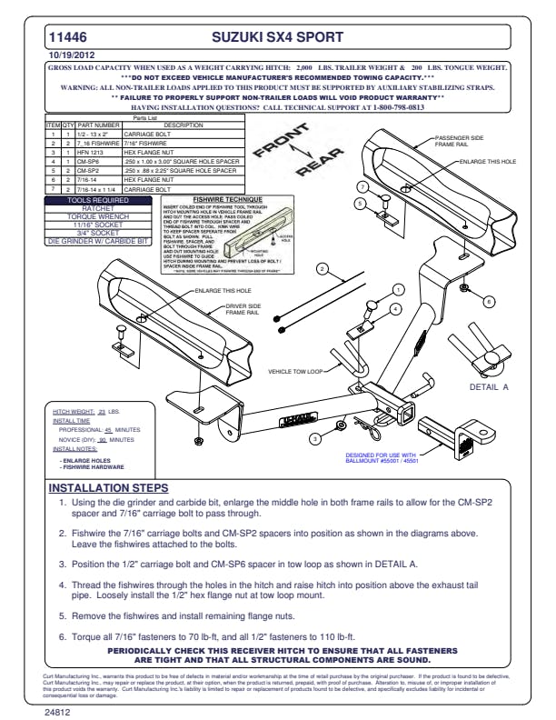 Connect to your lifestyle with a custom hitch receiver from CURT. All of our custom hitches are designed for a vehicle-specific fit, manufactured with pride, finished for industry-leading rust resistance and tested to rigorous SAE J684 standards for safety. This class 1 trailer hitch and ball mount combination is designed for a custom fit on select years of the Suzuki SX4 (see application info to verify fitment). The hitch integrates with the vehicle's frame and provides a useful and dependable 1-1/4 x 1-1/4 receiver. The receiver is perfect for attaching the included ball mount and towing a small trailer, or for adding cargo space with a hitch-mounted cargo carrier, bike rack or other accessory. This particular class 1 hitch is rated for 2,000 pounds gross trailer weight and 200 pounds tongue weight (never exceed the lowest-rated towing component). The ball mount included with this trailer hitch quickly and easily installs into the hitch receiver and has a 3/4 trailer ball hole (trailer ball not included). It can be mounted in the rise or drop position to promote level towing. Like all CURT custom hitches, this class 1 hitch is protected with our co-cured finishing process. It is descaled for a smooth surface, immersed in liquid A-coat for rust resistance inside and out, covered with a durable black powder coat and finally co-cured for an industry-leading rust, chip and UV-resistant shield. No matter where you're headed or which season of the year you’re towing in, this CURT hitch is equipped for long-lasting resilience to the elements. It features an open-back receiver for easy cleaning, and it comes with all the hardware necessary for the installation.